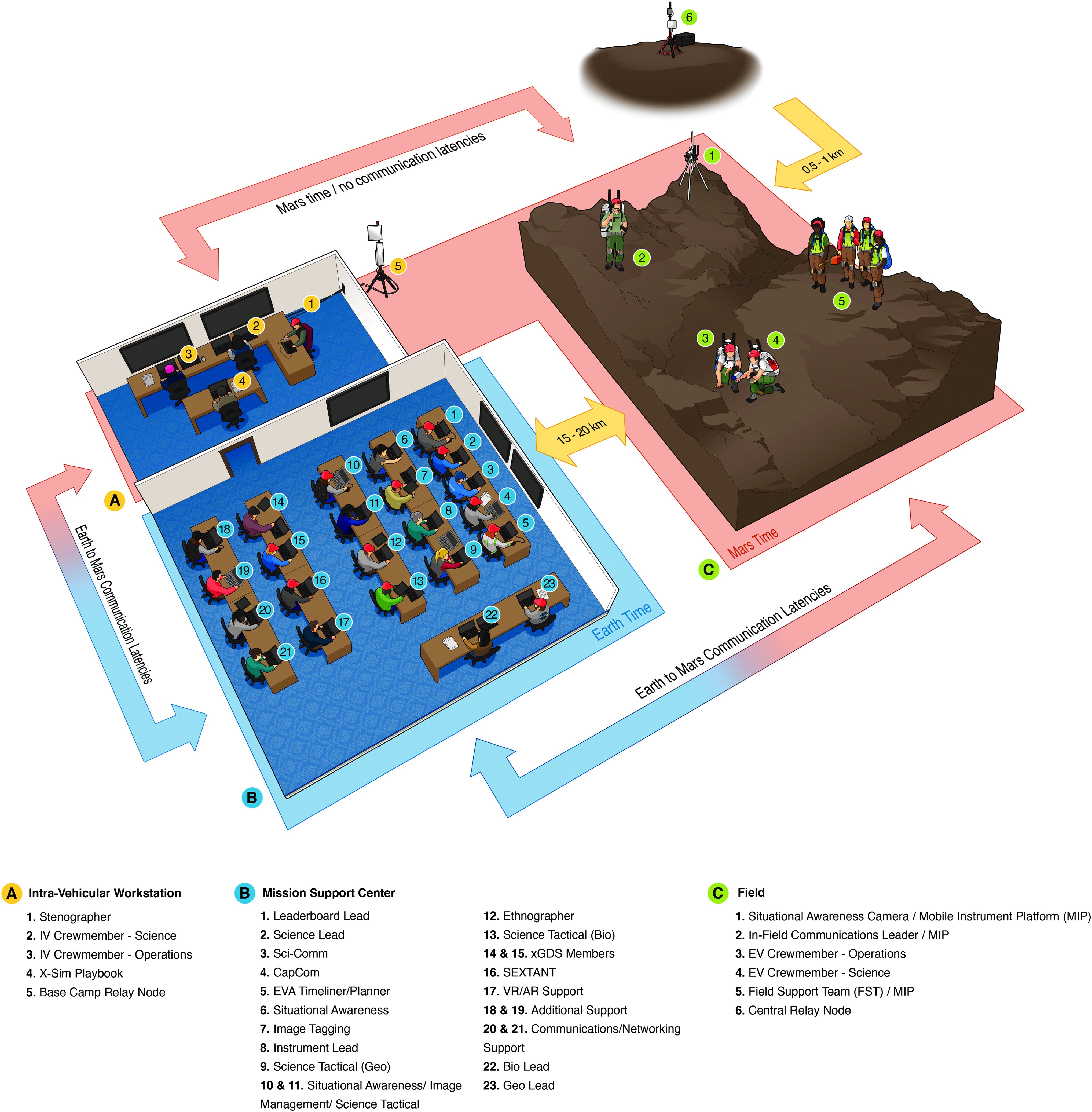 Det simulerade uppdraget omfattade tre team: astronauterna på marken (extraveikulära eller EVA), som kommunicerade i realtid med astronauterna i en omloppsbana (intraveikulära eller IVA), och uppdragskontrollen här på jorden, där ett team av forskare observerade och analyserade all information och video som samlats in av EVA-teamet. Så här arbetade teamet (diagram nedan : Lim et al., 2019)