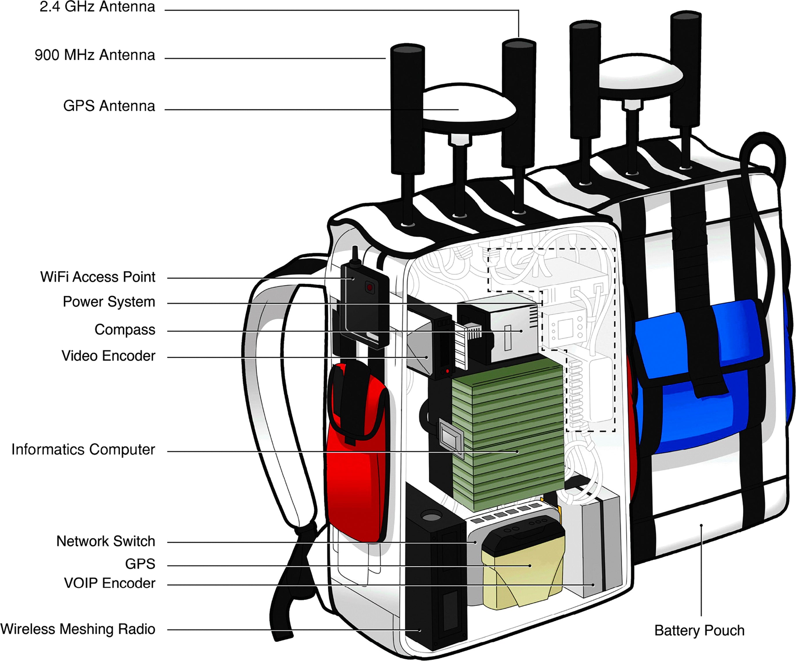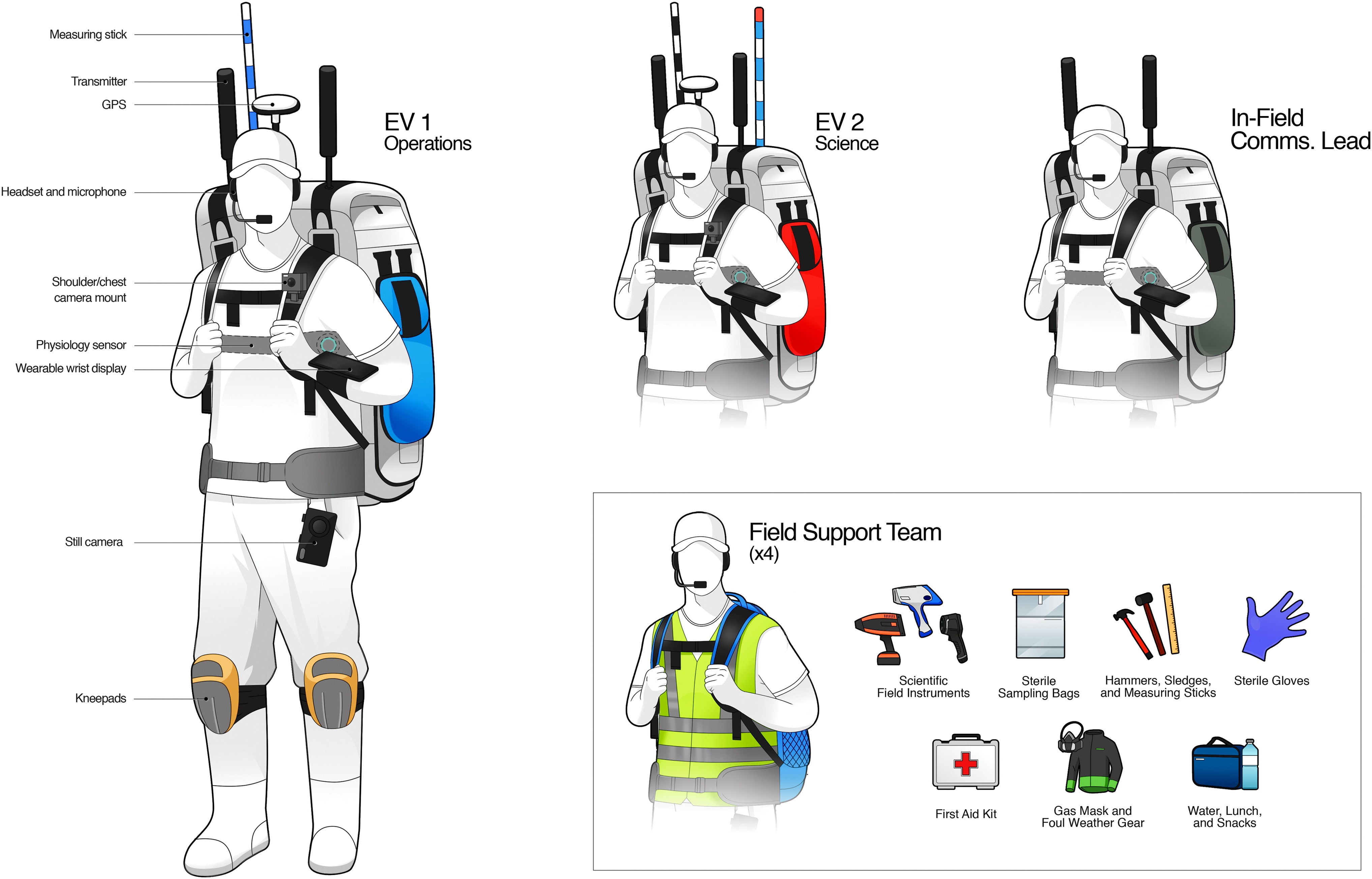 "Väskorna måste skydda känslig elektronisk utrustning som ansvarar för att vidarebefordra BASALT-OnSight: ett uppslukande, tredimensionellt (3D) XR-terrängmodelleringsverktyg, HoloSkype: en AR-teknik som möjliggör ritning av virtuella anteckningar ovanpå den verkliga världen av EV- och IV-personal och underlättar kommunikation i realtid, och HoloSEXTANT: en AR-funktion som ger realtidsnavigering och vägplaneringsvisualisering överlagrad på den fysiska världen för EV-personal." (Abercromby et al., 2020)