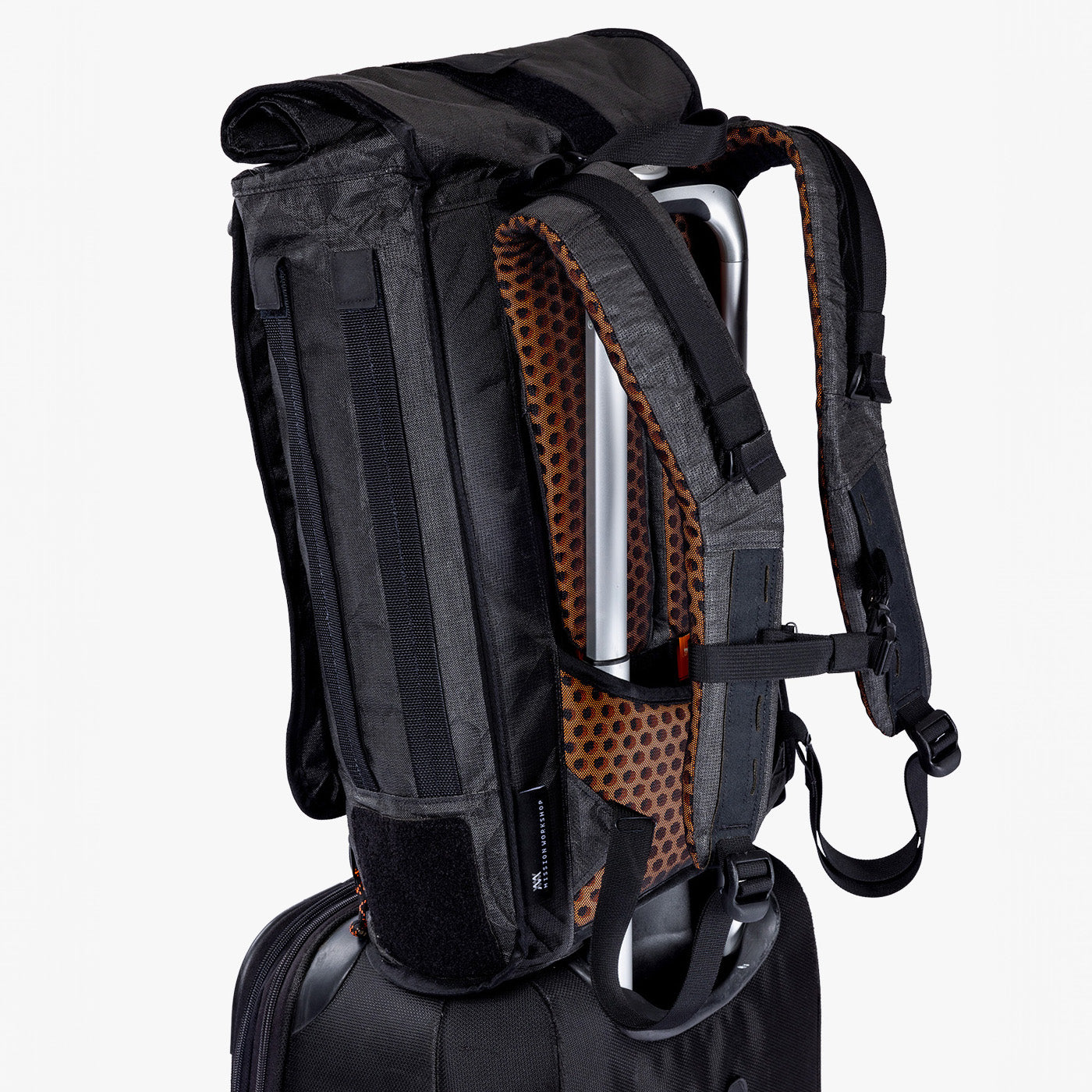 Ländryggen är försedd med en kraftig genomgång för bagagehandtaget som gör att ryggsäcken kan förbli i vertikalt läge när den används med rullande bagage.